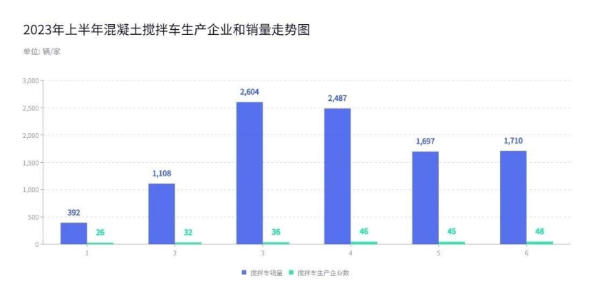 2023年上半年共有67家企業(yè)實(shí)現(xiàn)混凝土攪拌運(yùn)輸車的銷售。從數(shù)據(jù)可以看出,第一季度實(shí)現(xiàn)銷售的企業(yè)數(shù)量與混凝土攪拌運(yùn)輸車銷量的走勢保持一致;但第二季度混凝土攪拌運(yùn)輸車的銷量開始下滑,實(shí)現(xiàn)銷售的企業(yè)數(shù)量并沒有隨之下滑,反而呈現(xiàn)小幅增長趨勢,但實(shí)際上平均銷量在減少。