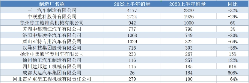 但位列前三甲的三一和中聯(lián)重科的銷量呈明顯下滑趨勢,徐工施維英的銷量與2022年上半年相比小幅上漲。其中,成都大運(yùn)和徐工汽車的銷量漲勢喜人,同別分別增長122%和608%。