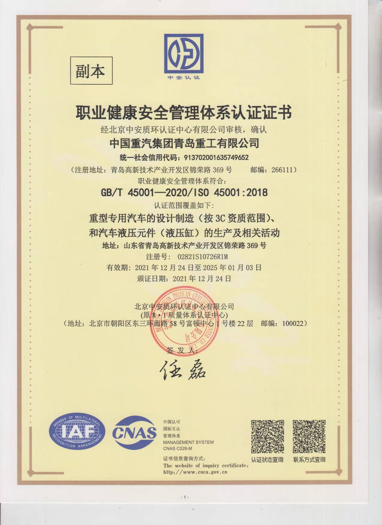 職業(yè)健康安全管理體系證書