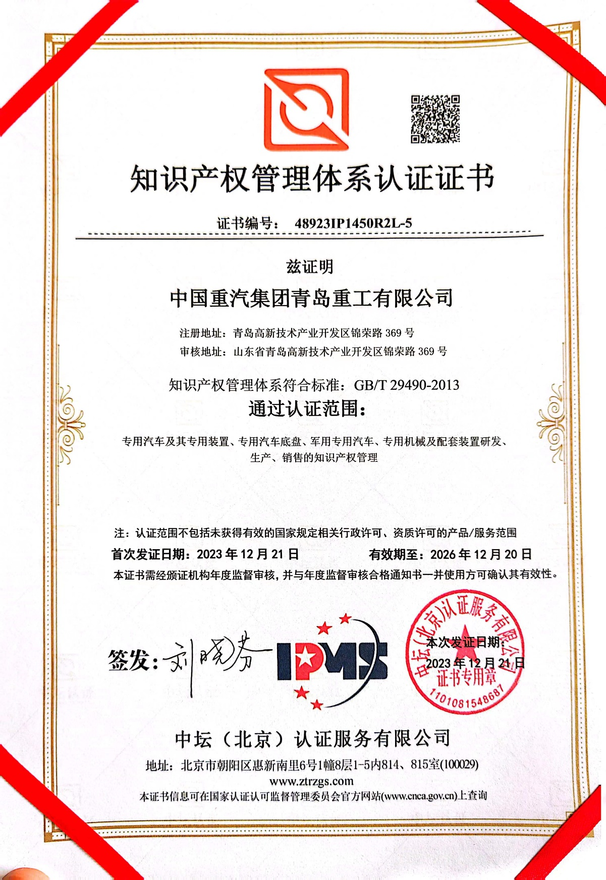 知識產(chǎn)權(quán)管理體系認(rèn)證證書
