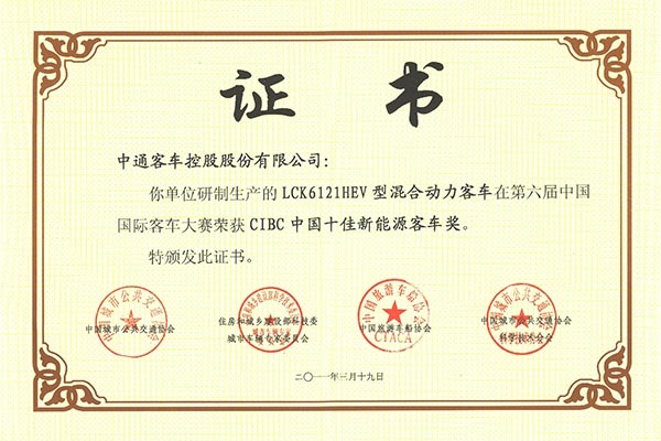 • LCK6121HEV Awards China TOP 10 New Energy bus