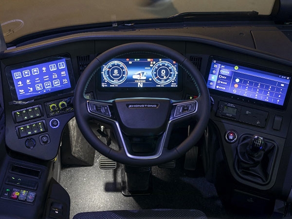 On the right, the central control screen is integrated with functions including navigation, monitoring, voice control, interconnection of mobile and coach, etc.