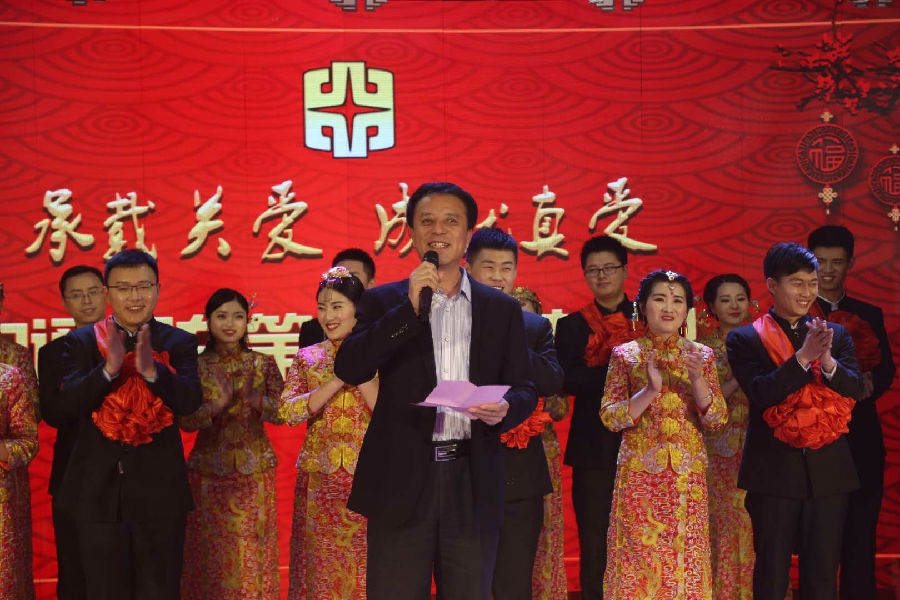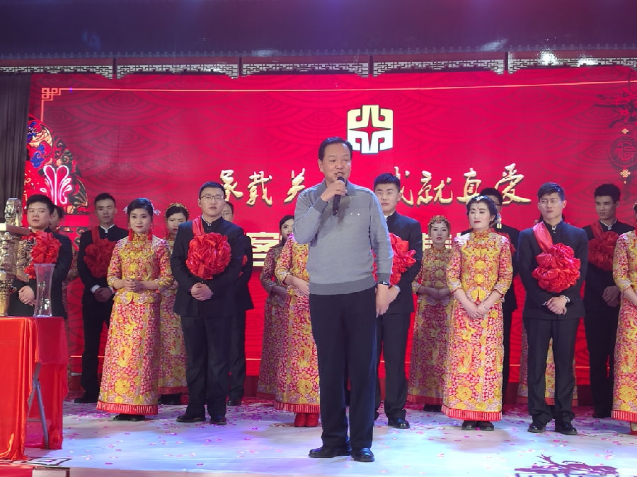 “新中式”禮儀,去傳統(tǒng)之糟粕,皆現(xiàn)代文明精華,引入企業(yè)文化理念。婚禮儀式在現(xiàn)代震撼的燈光秀和傳統(tǒng)熱鬧的舞獅表演拉開序幕,11對新人陸續(xù)登臺,敬天祈福,感恩答謝,公司總經(jīng)理孫慶民先生為新人證婚、董事長李樹朋先生為新人主婚、嘉賓山東省交通廳高洪濤廳長也給新人帶來美好的新婚祝福。